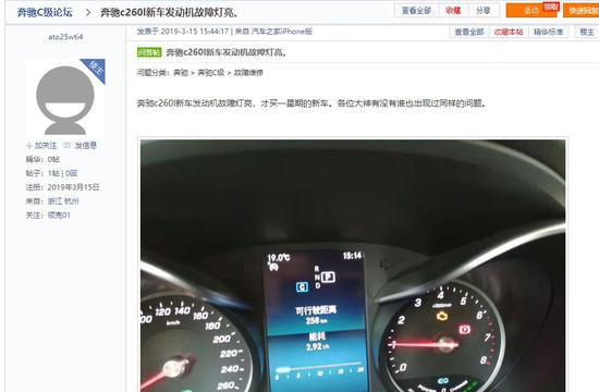 至于汽车故障灯亮起,一位曾参与4S店管理的业内人士告诉《消费者报道》,一般有两种可能,一是发动机出故障,指示灯会指示具体哪里出故障,解决完故障灯就会熄灭,二是发动机本身没有故障,只是传感器出现问题,导致误报信息给电脑板,故障灯顺势就亮了,一般是更换新的传感器或者新的电脑板,“但不管怎么说,配货30天时间也太久了,C260L是国产的,国内4S店应该会有常备电脑板。”