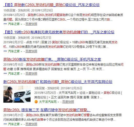 奔驰C260L出现电脑故障并非个例,本刊搜索汽车之家、太平洋汽车网、百度贴吧等论坛发现有多起关于“奔驰C260L发动机故障灯亮起”的投诉,但由于是新车上市,该情况发生的原因尚未有明确论断。2019款奔驰C260L于2018年10月上市,是4门5座三厢车,厂家指导价约35万元,用的是全新的混动发动机。